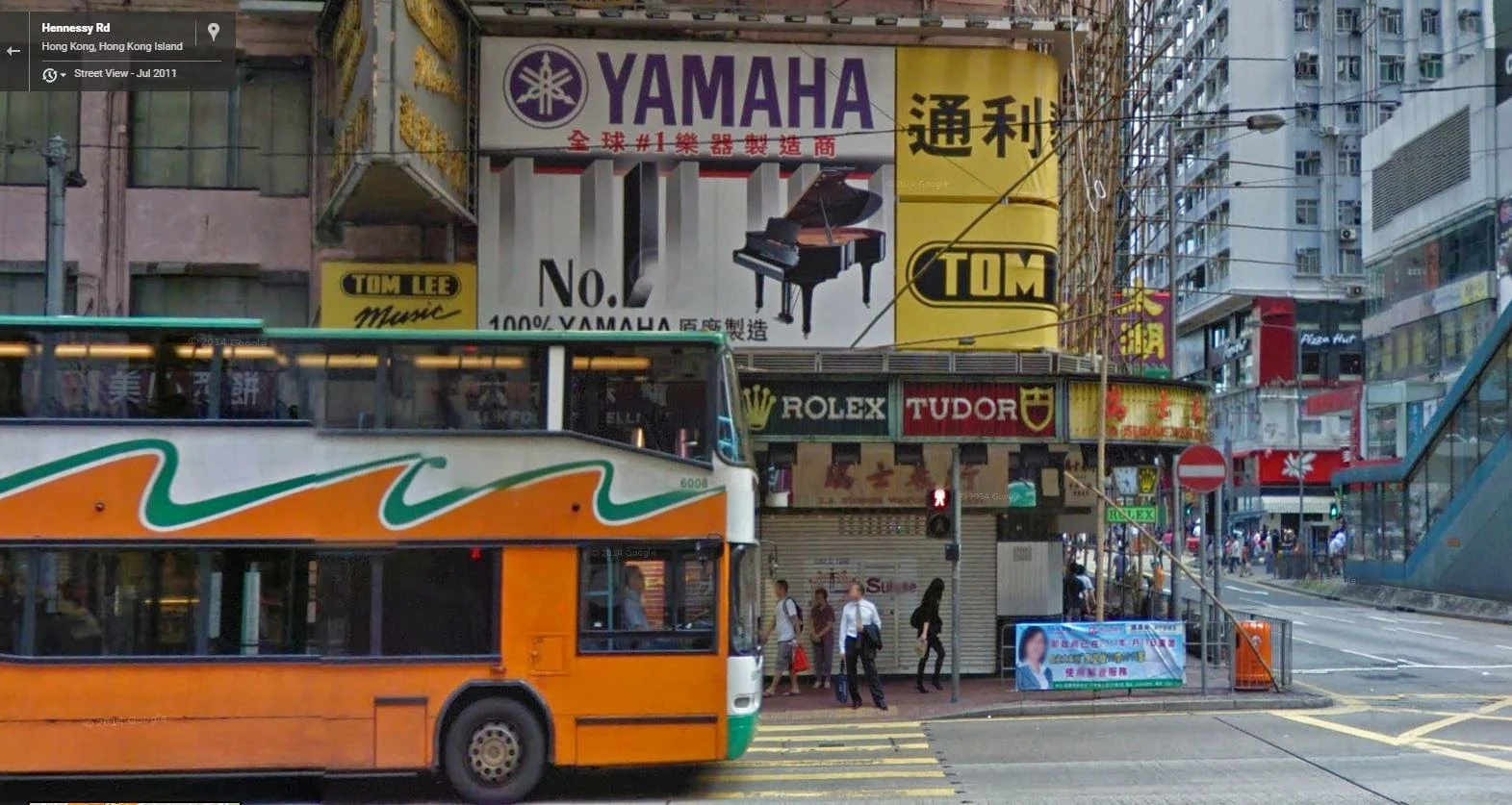 Take note of the Rolex and Tudor signs in the top picture - here is the same sign today, taken from streetview on the northern side of Hennessy Rd where it joins with Percival Street. The buildings at the back right include the still-standing (as you can see) Po Hon Building (built 1967) further up Percival St. The shop the sign belongs to is (still) called the "La Suisse Watch Company Ltd" and the building itself is the East South Building at 475 - 481 Hennessy Road.