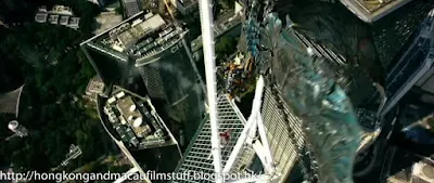 One of Hong Kong's iconic buildings gets a thorough seeing to when one of the dino-robotic thingymajigs flys around it and takes a fall.