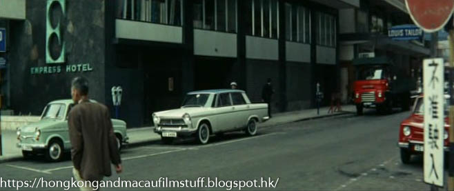 Actually, this is a great sequence in the film from a location standpoint because it shows the old army camp on the opposite side of Chatham Road South, now the location for the History and Science museums as well as all the other development that has become known as East Tsim Sha Tsui. If you look at the first image, it looks as though there was some sort of religious organisation opposite the hotel which would now mark where Mody Road continues on the other side of Chatham Road South.