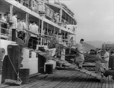 Another matching shot is the footage used for the passengers disembarking the ferry. In Macao, the footage is used alone first, and then is repeated for a back-projection shot showing the main characters getting off the ferry. In Forbidden, it serves only as back projection for Tony Curtis' character alighting.